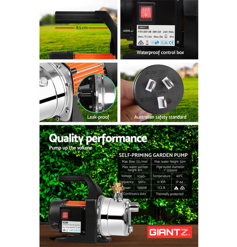 Giantz Stage 1500W High-Pressure Garden Water Pump Tank Rain Farm Irrigation Made from durable stainless steel and alloy, this garden pump is the perfect water pump for your home and garden. It is ideal for...