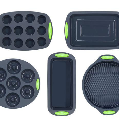 Product Category: Cake MoldShape: IrregularMaterial: Silicone5 piece set:12 even mould muffins, rectangular plate, 7 even mould donuts,Toast, disc